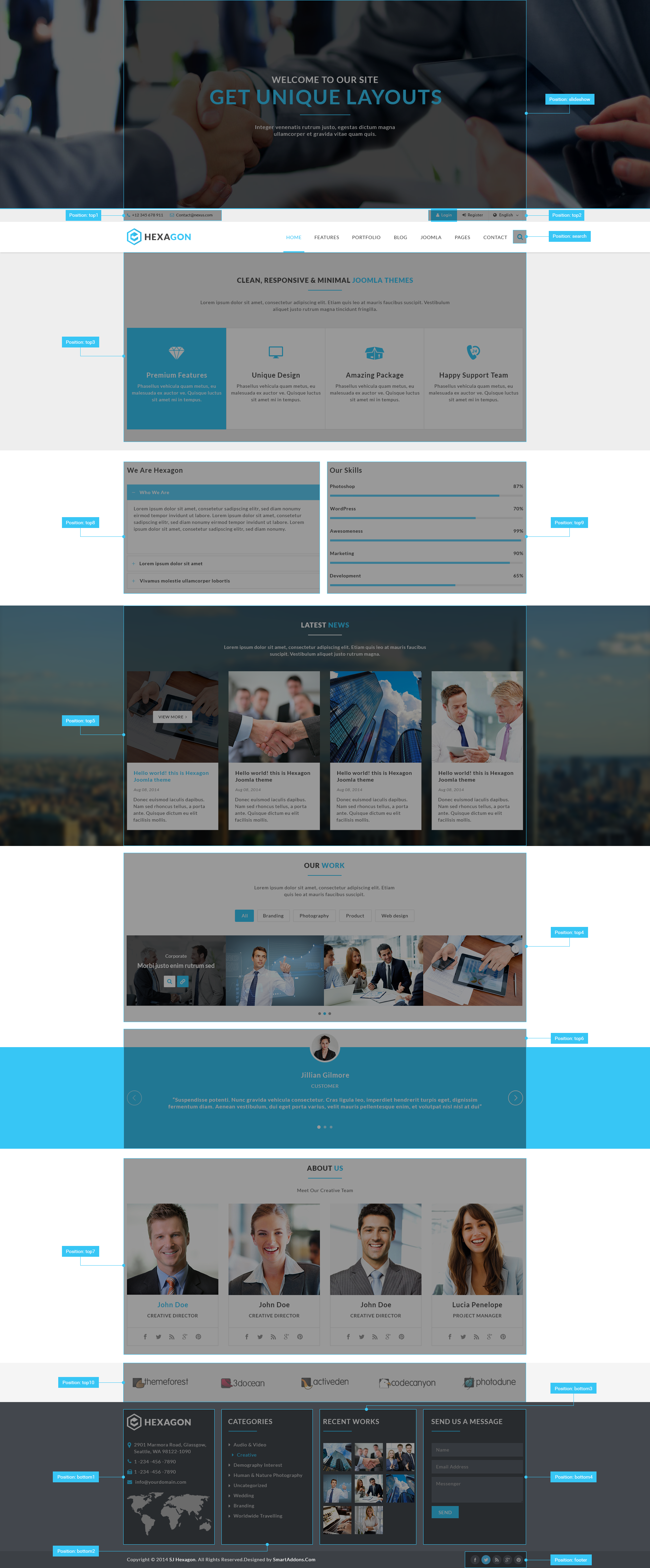 This Joomla! template supports a wide variety of module positions which can be archived automatically by the system.The module positions are fully collapsible mean that if there are no modules published in particular position, this module position will disappear and the other modules with take this place. Also you can have 2-Columns layout (content, left or right)